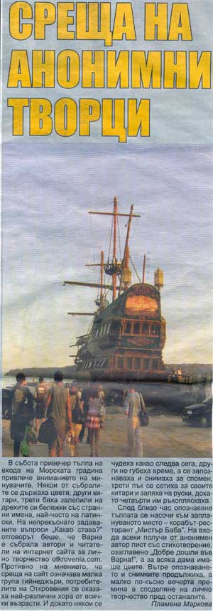 Репортаж от срещата на откровениците във Варна, публикуван от младата ни журналистическа надежда Пламена Маркова във варненския вестник "Диалог".